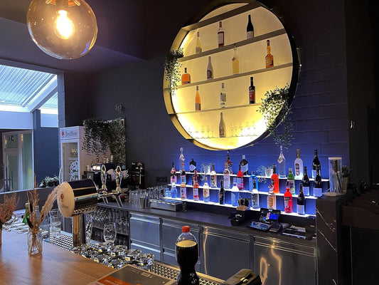 Flaschentreppe beleuchtet 40cm mattschwarz RGBW Fernbedienung Plexiglas Bar Restaurant Gastro Ausstatung Regal Flaschen Stufenregal beleuchtet